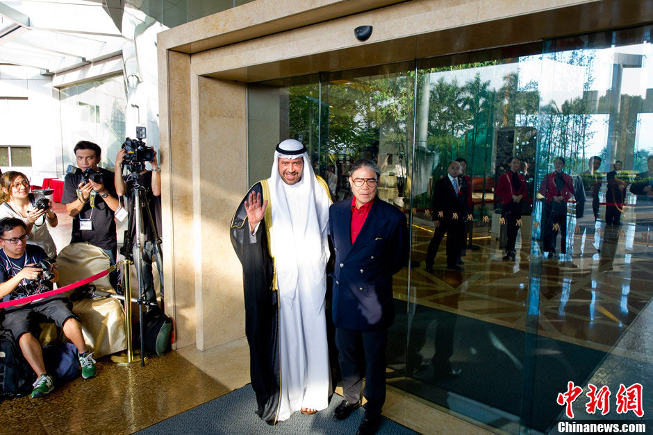 郭晶晶与霍启刚10日正式在广州南沙拉开两场“背靠背”的婚宴。图为亚奥理事会主席、科威特亲王艾哈迈德•法赫德•萨巴赫在霍震霆陪同下抵达南沙大酒店。龙宇阳 摄