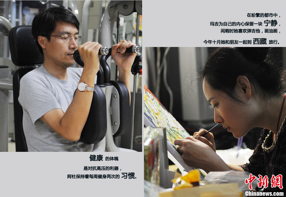 健康的体魄是对抗高压的利器,阿杜保持着每周健身两次的习惯(左图)。在纷繁的都市中,玛吉为自己的内心保留一块宁静,闲暇时她喜欢弹吉他,画油画,今年十月她和朋友一起到西藏旅行(右图)。文/图 中新网记者 李美多