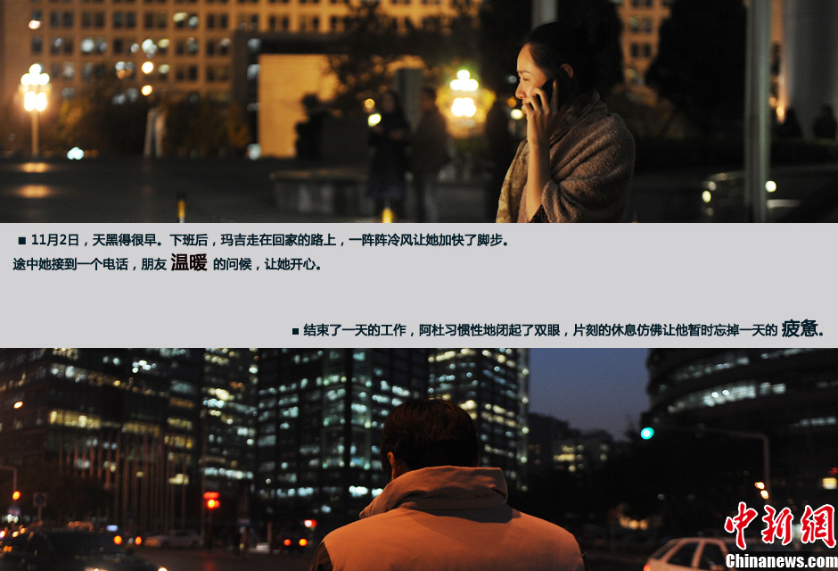 11月2日,天黑得很早。下班后,玛吉走在回家的路上,一阵阵冷风让她加快了脚步。途中她接到一个电话,朋友温暖的问候,让她开心(上图)。结束了一天的工作,阿杜习惯性地闭起了双眼,片刻的休息仿佛让他暂时忘掉一天的疲惫(下图)。文/图 中新网记者 李美多