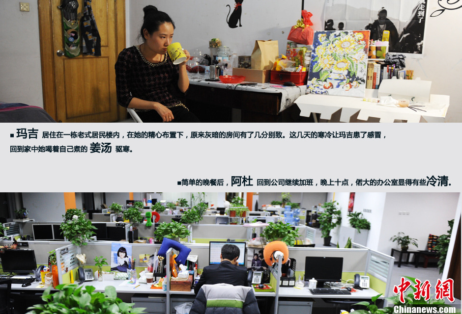 玛吉居住在一栋老式居民楼内,在她的精心布置下,原来灰暗的房间有了几分别致。这几天的寒冷让玛吉患了感冒,回到家中她喝着自己煮的姜汤驱寒(上图)。简单的晚餐后,阿杜回到公司继续加班,晚上十点,偌大的办公室显得有些冷清(下图)。文/图 中新网记者 李美多
