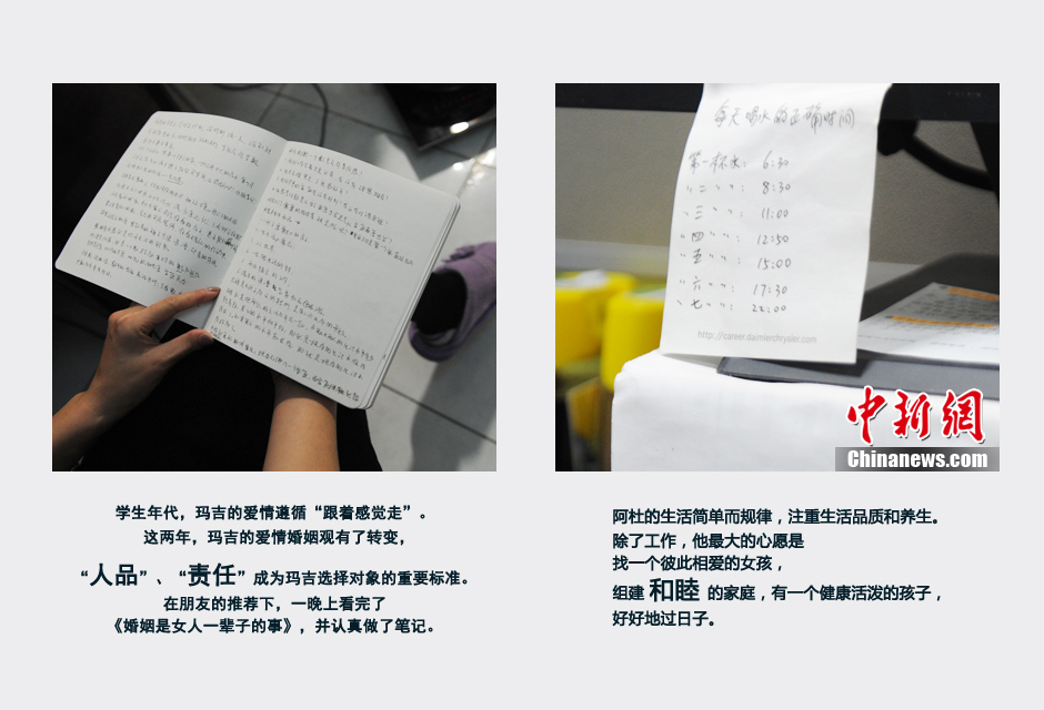 学生年代,玛吉的爱情遵循“跟着感觉走”。这两年,玛吉的爱情婚姻观有了转变,“人品”、“责任”成为玛吉选择对象的重要标准。在朋友的推荐下,一晚上看完了《婚姻是女人一辈子的事》,并认真做了笔记(左图)。阿杜的生活简单而规律,注重生活品质和养生。除了工作,他最大的心愿是找一个彼此相爱的女孩,组建和睦的家庭,有一个健康活泼的孩子,好好地过日子(右图)。文/图 中新网记者 李美多