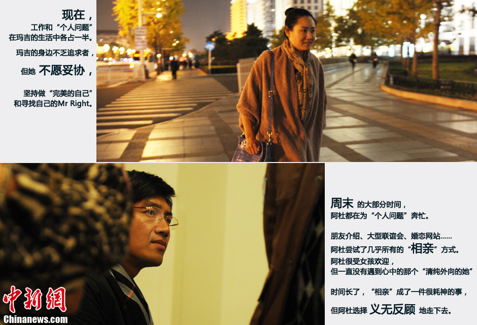 现在,工作和“个人问题”在玛吉的生活中各占一半。玛吉的身边不乏追求者,但她不愿妥协,坚持做“完美的自己”和寻找自己的Mr Right(上图)。 周末的大部分时间,阿杜都在为自己的“个人问题”奔忙。朋友介绍、大型联谊会、婚恋网站……阿杜尝试了几乎所有的“相亲”方式。阿杜很受女孩欢迎,但一直没有遇到心中的那个“清纯外向的她”。时间长了,“相亲”成了一件很耗神的事,但阿杜选择义无反顾地走下去(下图)。文/图 中新网记者 李美多