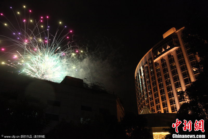 2012年11月10日讯,广东,郭晶晶、霍启刚广州南沙大酒店婚宴当天。晚上九时四十五分,烟花区演正式开始,在美妙的音乐伴奏下,一朵朵光亮的烟花划破夜空,场面壮观,烟花在夜空灿烂展现了五分钟,为“刚晶”的南沙大婚宴划上完满句号。图片来源:CFP视觉中国