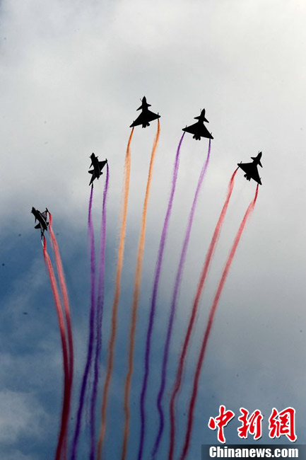 2012年11月10日,广东省珠海市,八一飞行表演队歼十战机做编队飞行练习。八一飞行表演队将在珠海航展上做精彩编队飞行表演。钟凡 摄 图片来源:CFP视觉中国