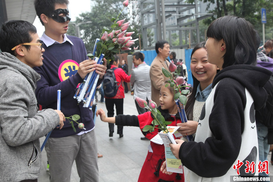 重庆闹市现“光棍侠” 派发千朵玫瑰求“脱光”