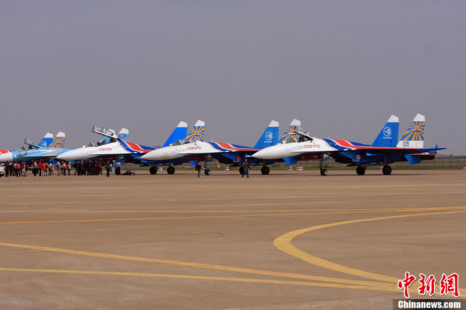 11月11日中午,俄罗斯空军“勇士”飞行表演队五架SU27战机顺利飞抵珠海。图为俄罗斯空军“勇士”五架SU27战机。中新社发 冒韪 摄