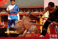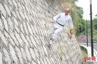 福建南少林武僧“飞墙走壁”登上5米高墙