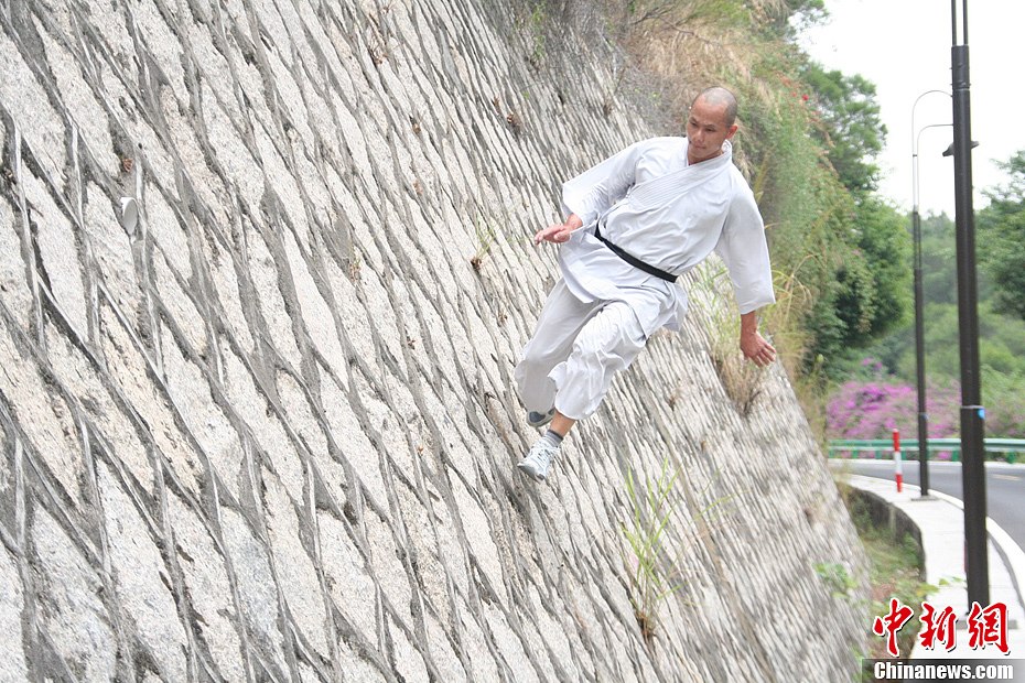 11月12日,福建泉州南少林武僧释理亮在泉州清源山展示南少林绝技“飞墙走壁”,成功登上5米高墙头,刷新了他个人“飞墙走壁”的纪录。释理亮,俗家名吴小亮,长期以来苦练南少林绝技,练就“一指禅”和“水上漂”少林绝技,其中“水上漂”功夫能在水上“漂”出45米。图为释理亮展示“走壁”绝技。中新社发 苏巧凤 摄