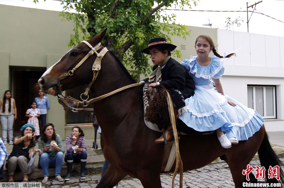 当地时间11月11日,阿根廷San Antonio de Areco,民众盛装骑马参加活动,庆祝“传统日”。