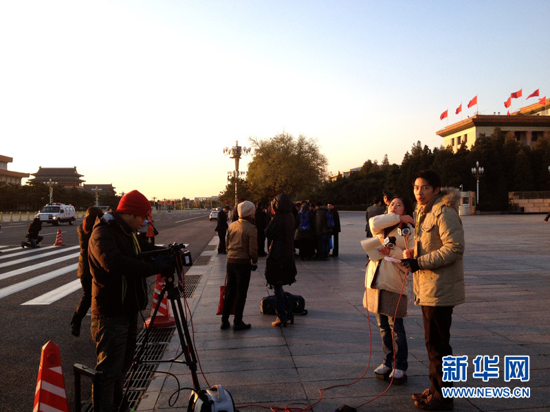 中国共产党第十八次全国代表大会闭幕会11月14日上午在人民大会堂举行。图为记者早早赶到人民大会堂外做报道的准备工作。温馨 摄 图片来源:新华网