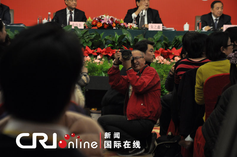 也不是所有的记者都将注意力对准台上的官员。李蔚 摄 图片来源:国际在线