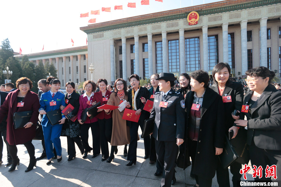 11月14日,中国共产党第十八次全国代表大会在北京人民大会堂闭幕。图为来自各行各业的女代表列队走出大会堂。中新社发 盛佳鹏 摄