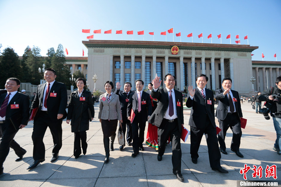 11月14日,中国共产党第十八次全国代表大会在北京人民大会堂闭幕。图为代表走出人民大会堂。中新社发 盛佳鹏 摄