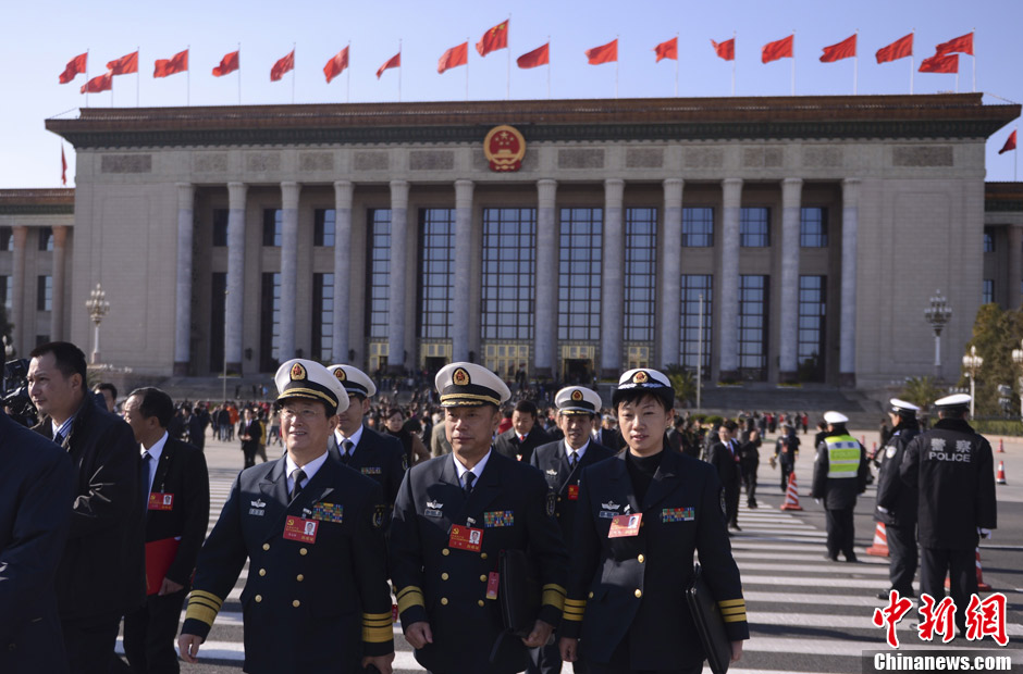 11月14日,中国共产党第十八次全国代表大会在北京人民大会堂闭幕。图为军方代表步出人民大会堂。中新社发 廖攀 摄