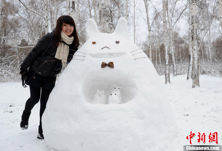 长春市民堆雪人取乐 “龙猫”造型惟妙惟肖