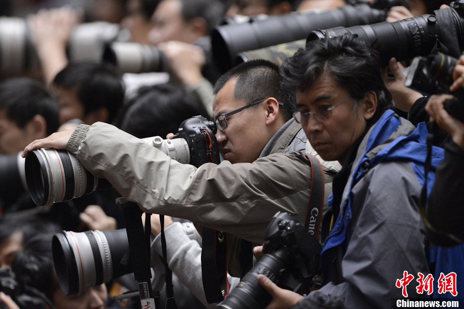 11月14日,中国共产党第十八次全国代表大会在北京人民大会堂举行闭幕会。记者紧张拍摄会议。中新社发 廖攀 摄