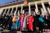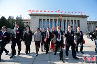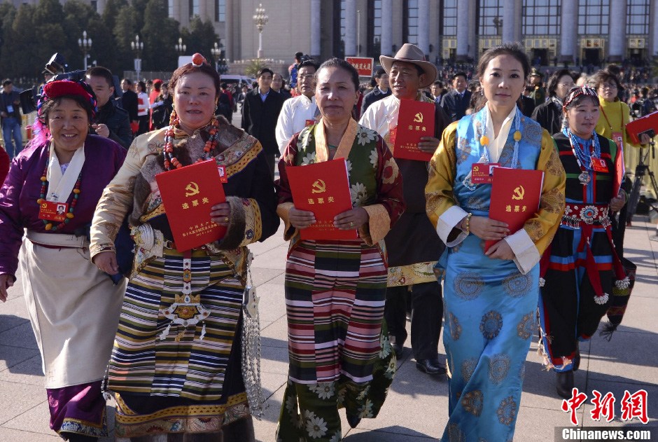 11月14日,中国共产党第十八次全国代表大会在北京人民大会堂闭幕。图为藏族代表手持选票夹步出会场。中新社发 廖攀 摄