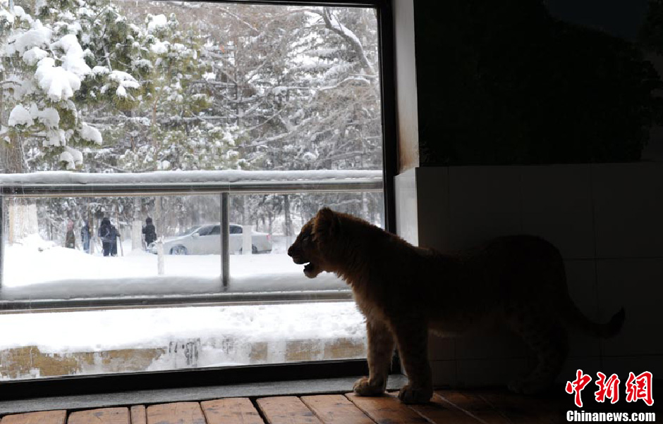 吉林省长春市连续两日的暴雪,将这座城市披上了一层厚厚的“雪衣”。11月14日,记者在长春动植物公园看到,这里的东北虎、熊、狼等猛兽,面对皑皑白雪也显得十分兴奋,在雪地上不断地撒欢。小狮子由于年龄小的原因不能外出,它对外面的世界充满期待。