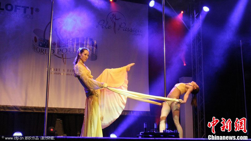 11月14日讯,瑞士苏黎世,11月10日,2012世界钢管舞锦标赛赛况。图为依繁,曹诺。