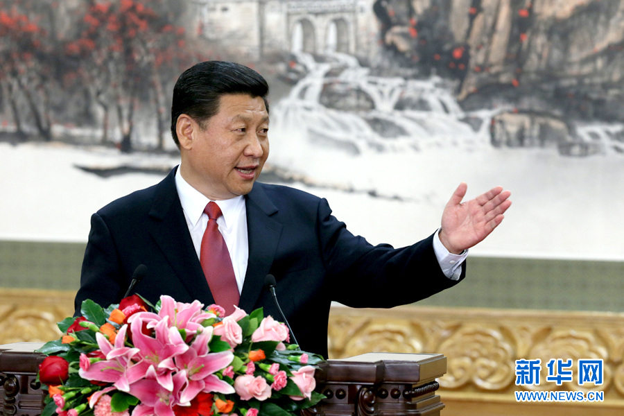 11月15日,刚刚在中共十八届一中全会上当选的中共中央总书记习近平和中央政治局常委李克强、张德江、俞正声、刘云山、王岐山、张高丽在北京人民大会堂同采访十八大的中外记者亲切见面。这是习近平总书记发表讲话。鞠鹏 摄 图片来源:新华网