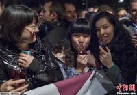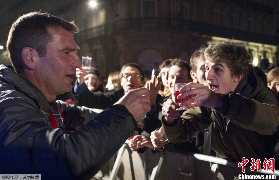 当地时间11月15日凌晨,法国里昂市中心,2012博若莱新酒正式上市,市民聚集在一起欢乐畅饮。