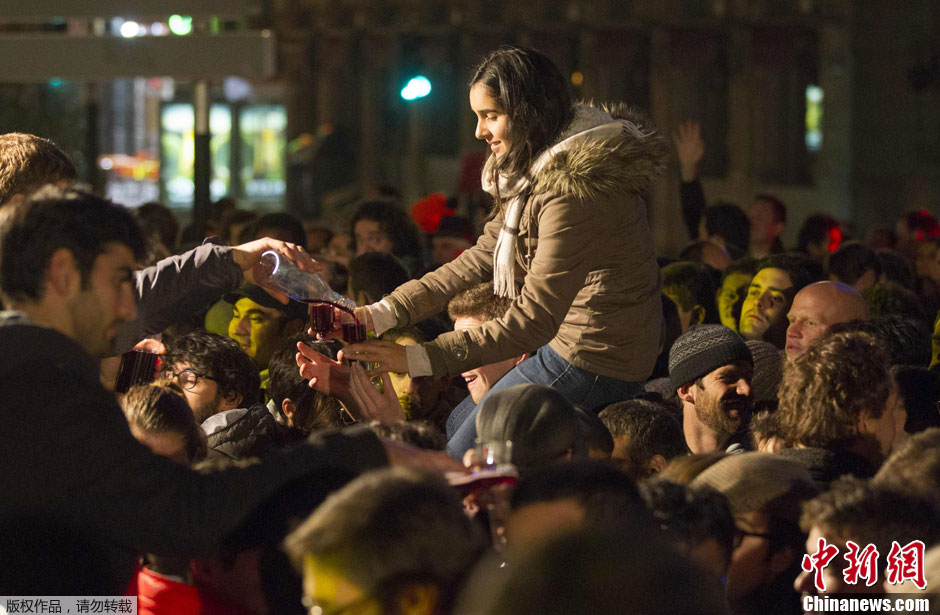 当地时间11月15日凌晨,法国里昂市中心,2012博若莱新酒正式上市,市民聚集在一起欢乐畅饮。
