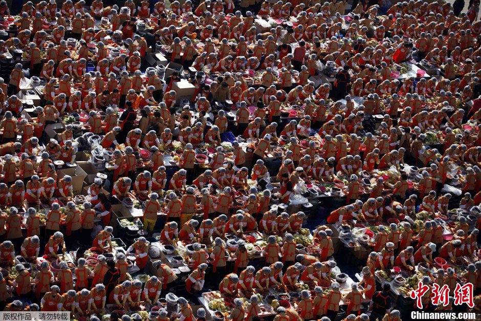 当地时间11月15日,韩国首尔市政厅广场举行了一个慈善活动,2000多名妇女志愿者一起制作韩国传统泡菜。据悉,在此次活动中制作的270吨泡菜,将用来救济那些有需要的人,帮助他们顺利过冬。