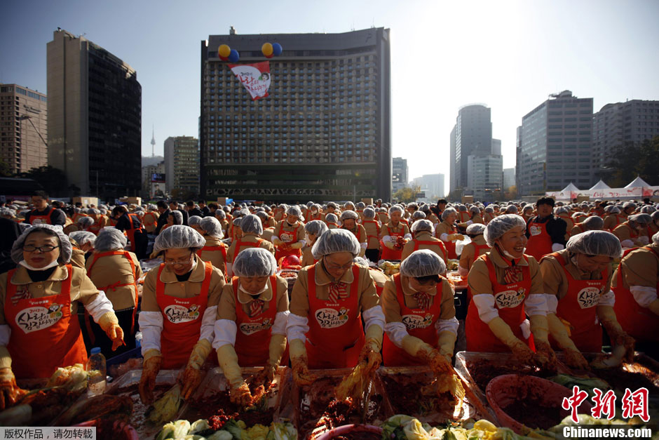 当地时间11月15日,韩国首尔市政厅广场举行了一个慈善活动,2000多名妇女志愿者一起制作韩国传统泡菜。据悉,在此次活动中制作的270吨泡菜,将用来救济那些有需要的人,帮助他们顺利过冬。