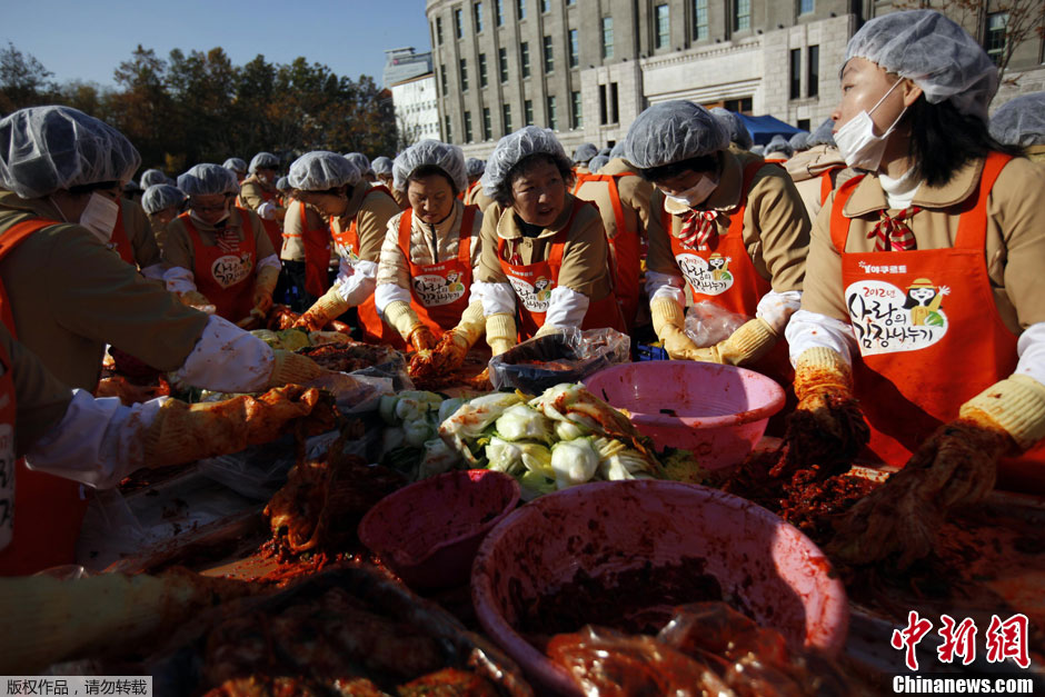 当地时间11月15日,韩国首尔市政厅广场举行了一个慈善活动,2000多名妇女志愿者一起制作韩国传统泡菜。据悉,在此次活动中制作的270吨泡菜,将用来救济那些有需要的人,帮助他们顺利过冬。