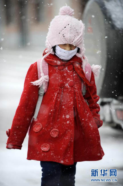 2012年11月15日,在宁夏固原市,儿童在雪中出行。当日,宁夏大部出现降雪天气。当地气象台发布道路结冰黄色预警信号,预计未来24小时,中卫市南部、吴忠市东南部和固原市有道路结冰,影响交通出行。李然 摄 图片来源:新华网