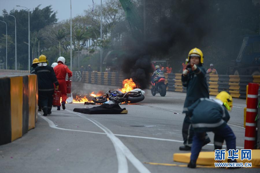 2012年11月15日,在澳门第59届格兰披治大赛车摩托车赛中,葡萄牙车手卡雷拉在行驶中失控撞栏,赛车焚毁,目前车手伤势严重。图为事故现场。张金加 摄 图片来源:新华网