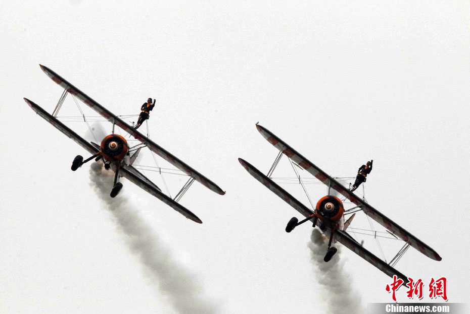 11月16日,在广东珠海市举行的“第九届中国国际航空航天博览会”进入第一个公众日。来自瑞士的“百年灵”飞行表演队,由两名美女分别站在两架波音史提曼飞机的机翼上翩翩起舞。循环转动、翻转、失速倒转,甚至倒立飞行,上演精采的“空中杂技”,给现场观众带来惊心动魄而又美妙的视觉享受。中新社发 楚天行 摄 图片来源:CNSPHOTO