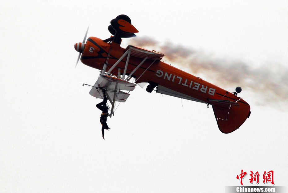 11月16日,在广东珠海市举行的“第九届中国国际航空航天博览会”进入第一个公众日。来自瑞士的“百年灵”飞行表演队,由两名美女分别站在两架波音史提曼飞机的机翼上翩翩起舞。循环转动、翻转、失速倒转,甚至倒立飞行,上演精采的“空中杂技”,给现场观众带来惊心动魄而又美妙的视觉享受。中新社发 楚天行 摄 图片来源:CNSPHOTO