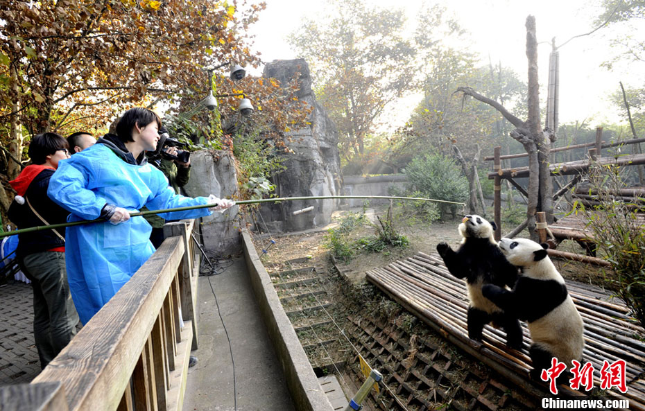 2012成都全球大熊猫守护使招募活动总决赛17日在成都大熊猫繁育研究基地举行,来自欧洲、北美、亚太、中国内地四个赛区的16名选手参加了终极PK。经过激烈的竞争后,来自法国的杰罗姆·普伊、美国的梅丽莎·卡茨以及中国的陈寅蓉最终胜出,当选“大熊猫守护使”。图为参加决赛的选手正在激烈角逐。安源 摄