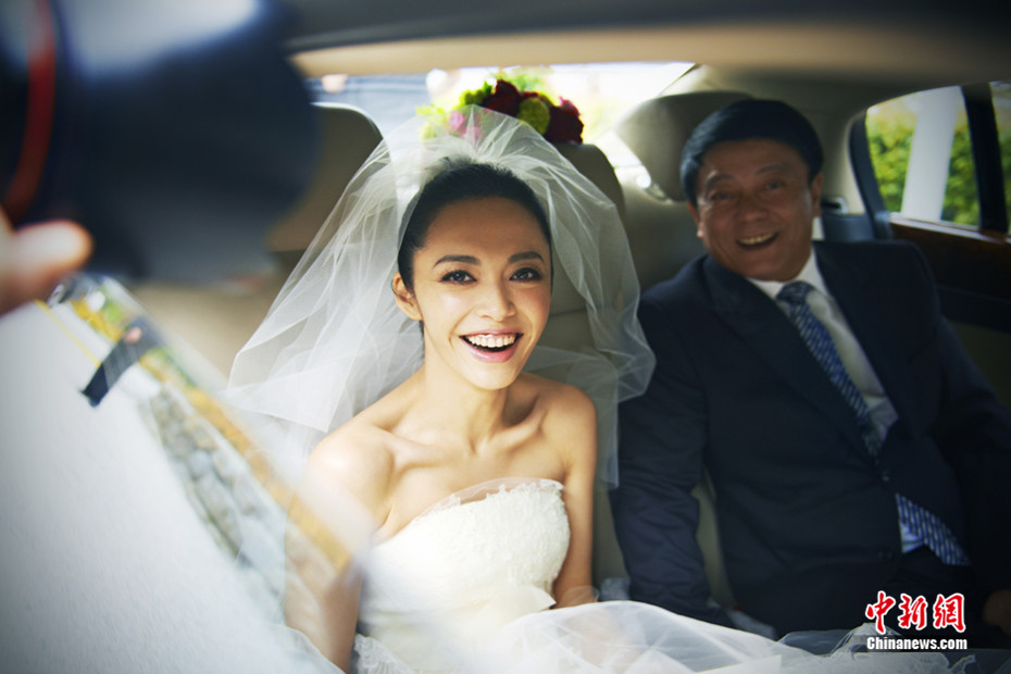 新西兰当地时间11月17日,姚晨和曹郁在双方少数亲友的见证下,于当地教堂低调完婚。当日,姚晨工作室向中新网发来婚宴现场的照片,身着洁白婚纱的姚晨在父亲的陪伴下步入Queenstown的St_Peters教堂,露出招牌式笑容,整个婚礼仪式庄重、简单、温馨,这位新娘与丈夫曹郁一起迎来人生的新起点。图为身着婚纱的姚晨与父亲在婚车内。