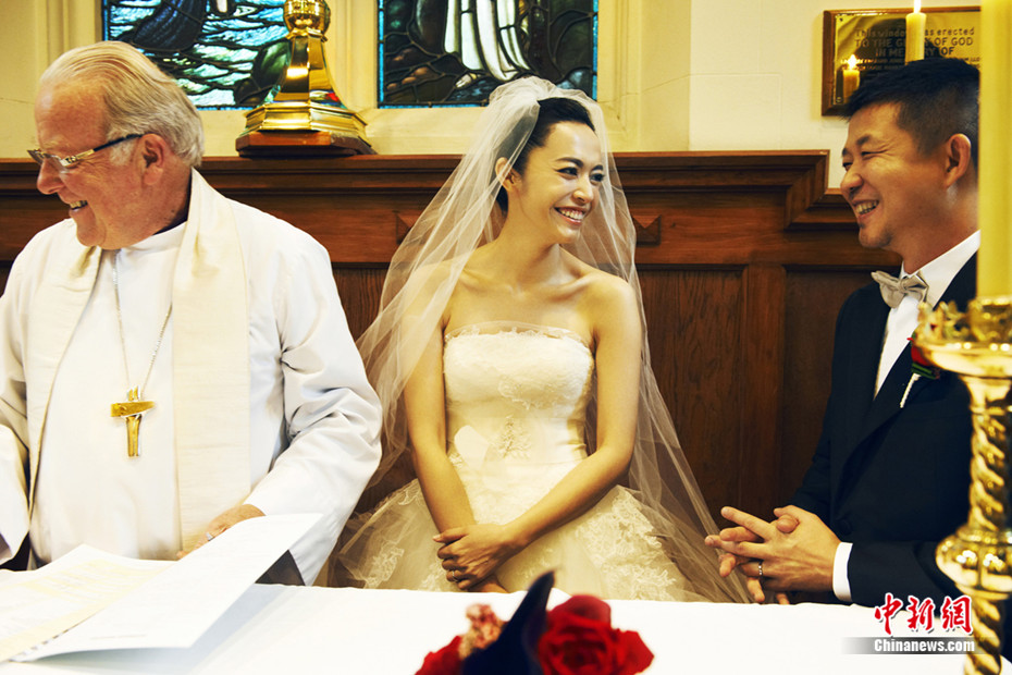新西兰当地时间11月17日,姚晨和曹郁在双方少数亲友的见证下,于当地教堂低调完婚。当日,姚晨工作室向中新网发来婚宴现场的照片,身着洁白婚纱的姚晨在父亲的陪伴下步入Queenstown的St_Peters教堂,露出招牌式笑容,整个婚礼仪式庄重、简单、温馨,这位新娘与丈夫曹郁一起迎来人生的新起点。图为姚晨曹郁夫妇与神父。