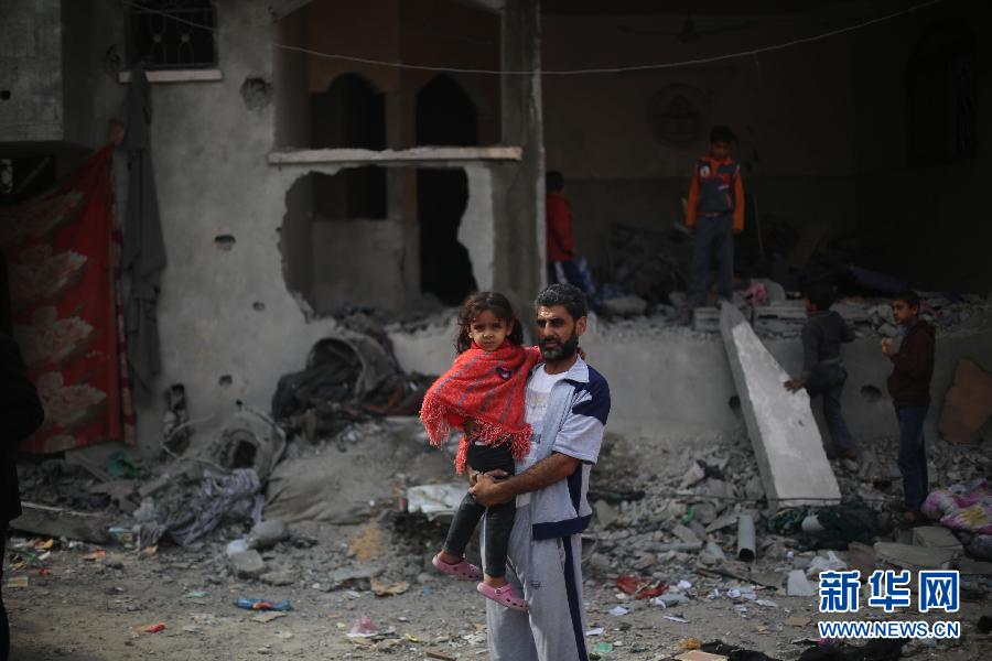 11月17日,在加沙城北部的杰巴利耶难民营,一名怀抱孩子巴勒斯坦人查看遭到空袭的家园。根据加沙医疗部门的消息,以色列战机17日继续轰炸加沙地带多处目标,造成10名巴勒斯坦人死亡。截至目前已有40名巴勒斯坦人在以军空袭中丧生,另有超过350人受伤。新华社发(纳赛尔摄) 图片来源:新华网
