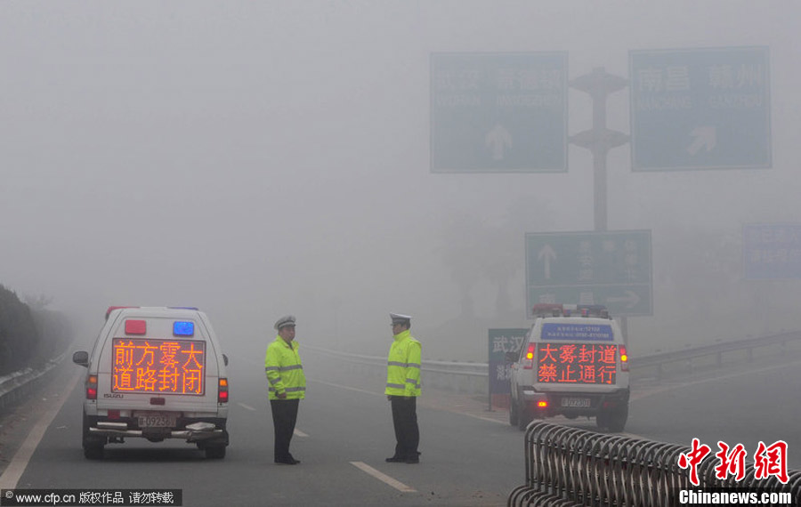 11月19日,江西杭瑞高速九景段,道路因大雾被封闭。胡国林 摄 图片来源:CFP视觉中国