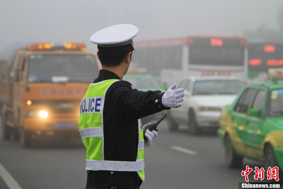11月19日,江西再遭浓雾笼罩,该省多个县市出现能见度不足1000米大雾,部分地区能见度小于30米。由于浓雾笼罩,江西省会南昌出现“城中不见楼、行人不见路”的情景。在弥漫的雾霾之中,来往车辆都开起了车灯。一名在路面指挥交通的应姓交警告诉记者,由于当天是周末后上班第一天,不少路段出现拥堵现象,车辆行驶缓慢。图为交警在弥漫的浓雾之中指挥交通。中新社发 刘占昆 摄