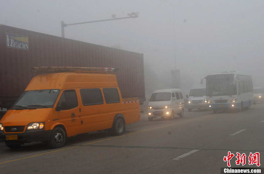 11月19日,浙江金丽温高速公路武义入口处因大雾封道,车辆排起长队。张建成 摄 图片来源:东方IC 版权作品 请勿转载