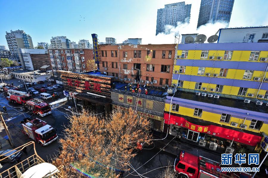 2012年11月19日,天津消防人员在现场灭火。当日上午9时许,位于天津市地标性建筑天塔附近的东方贵族商务会馆发生火灾。接到报警后,天津消防迅速派遣消防人员和20余辆消防车辆参与灭火。截至中午12时左右,火情已得到控制,有1人在火灾中受伤。张超群 摄 图片来源:新华网