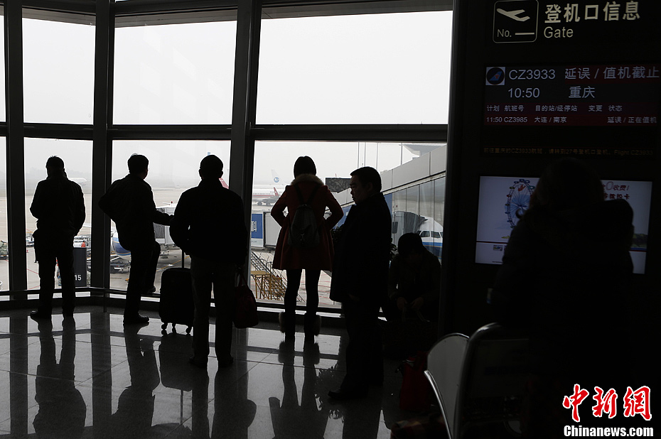 11月19日上午,长沙黄花机场候机大厅的乘客焦急地望着窗外,等待登机的消息。当日清晨,长沙黄花机场受大雾影响,所有航班均不能起降,受影响航班达47架次。黄花机场启动了黄色预警,临近中午,航班起降逐步正常。中新社发 刘关关 摄