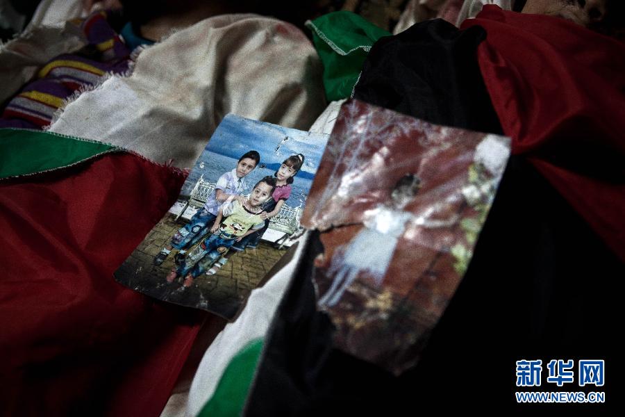 11月19日,在加沙城的希法医院,达卢子女的照片被放置在他们的遗体上。陈序 摄 图片来源:新华网