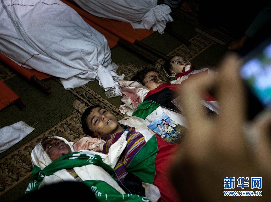 11月19日,在加沙城的希法医院,达卢家的4个遇难孩子等待下葬。陈序 摄 图片来源:新华网