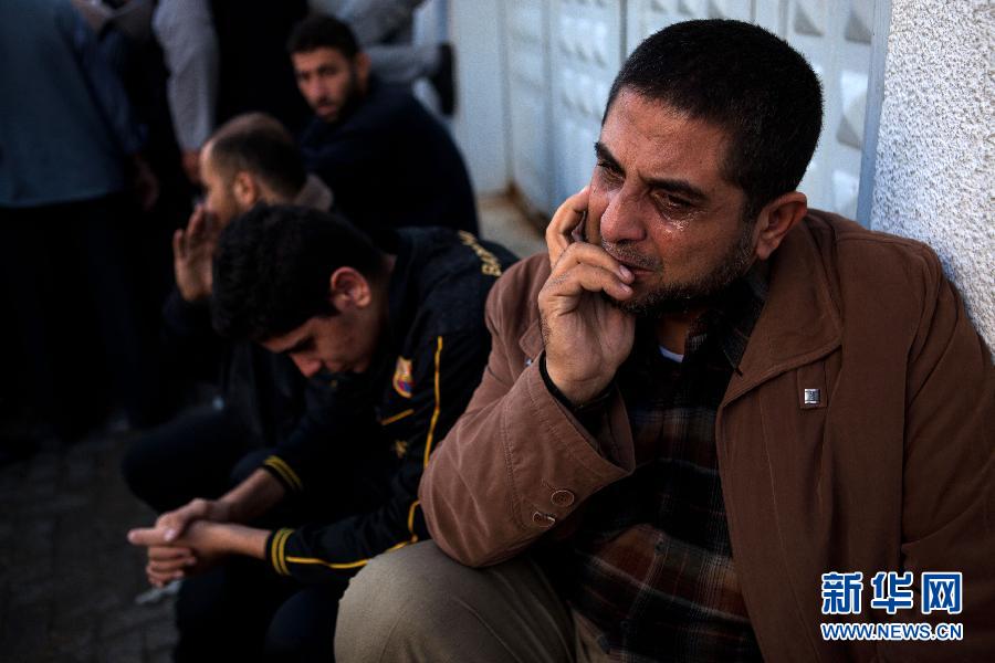 11月19日,在加沙城的希法医院,达卢(右)在停放着遇难亲属尸体的太平间外哭泣。陈序 摄 图片来源:新华网