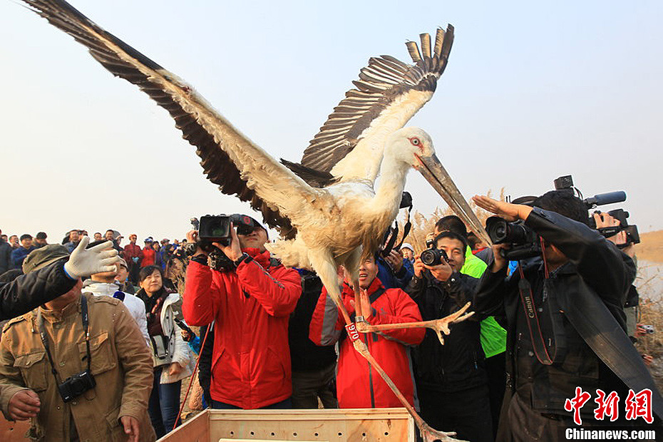 11月21日,备受关注的13只中毒东方白鹳在天津市大港独流碱河湿地成功放飞。为便于对其进行跟踪监测,中国鸟类环志中心专家已为它们佩戴环志。图为世界濒危物种东方白鹳放飞瞬间。图片来源:CFP视觉中国