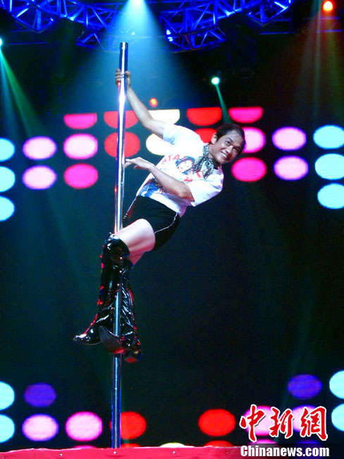 2012年11月21日,广西电视台综艺频道《挑战冠军王》栏目录制“王牌任务”节目。一位60岁的广西南宁环卫退休干部,主动挑战“跳钢管舞”任务。老人说,他从来没有接触过钢管舞,这个“任务”的目的就是要在最短的时间内激发人的潜能,所以,节目组只给他安排了一天的培训,就让他就上台表演了。最后,老人圆满地完成了这个“不可能”的任务。图片来源:东方IC 版权作品 请勿转载