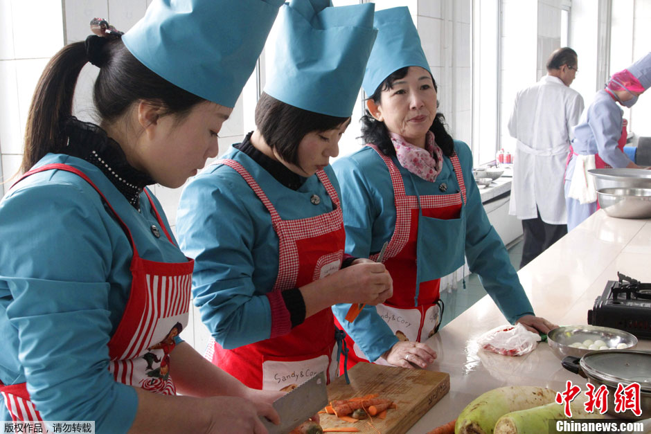 当地时间11月22日,来自朝鲜各地25个组织的厨师和服务员代表汇聚平壤,参加全国烹饪大赛的角逐。图为厨师们参加烹饪比赛。