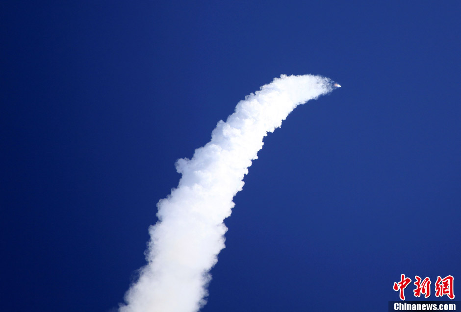 北京时间11月25日12时06分,中国在酒泉卫星发射中心用“长征四号丙”运载火箭,成功将“遥感卫星十六号”发射升空并送入预定轨道,这是中国“长征”系列运载火箭第172次航天发射。图为火箭尾焰穿越大气层时磨擦产生的白色烟雾在蓝天留下精美轨迹。孙自法 摄
