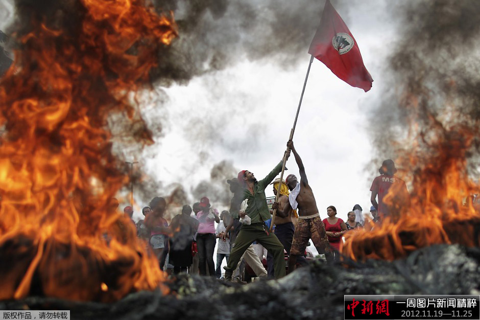 11月21日,巴西首都巴西利亚一条公路上,人们举着旗帜进行抗议,要求土地改革带来真正的改变。旁边是正在焚烧的轮胎。